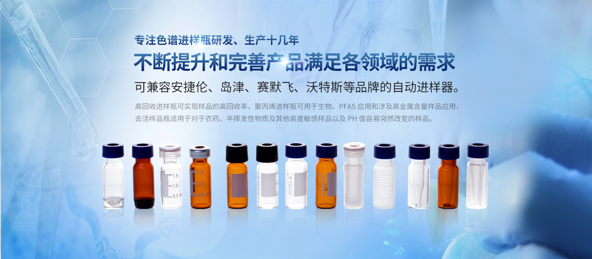浙江哈邁科技有限公司(簡(jiǎn)稱HAMAG),成立于2005年,總部位于美麗的海濱城市寧波,是中國(guó)優(yōu)質(zhì)色譜進(jìn)樣瓶、樣品瓶供應(yīng)商,是一家專業(yè)從事色譜耗材的科研、設(shè)計(jì)、生產(chǎn)、銷(xiāo)售和系統(tǒng)集成為一體的生產(chǎn)型企業(yè)。經(jīng)過(guò)十幾年的研發(fā)與努力,通過(guò)和國(guó)內(nèi)外多個(gè)科研部門(mén),浙江大學(xué)理工學(xué)院,同時(shí)與品牌:安捷倫、沃特世、島津等公司的技術(shù)交流與學(xué)習(xí),我們成功的研制開(kāi)發(fā)出實(shí)驗(yàn)室分析設(shè)備專用的各種型號(hào)的自動(dòng)進(jìn)樣瓶、頂空瓶及其配套蓋墊;特氟龍與硅膠復(fù)合墊片;特氟龍/硅膠制品;創(chuàng)新型固相萃取儀;針式過(guò)濾器等幾十種實(shí)驗(yàn)室耗材及關(guān)聯(lián)產(chǎn)品...